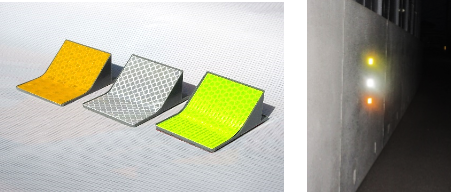 この製品はガードレール・コンクリート壁他に貼るため開発しました。4Mのガードレールビームに1個ないし2個を貼ることで、少ないコストで連続して長い距離に貼ることができます。基板の角度が45度角度構造なので「再帰性反射率をさらに高め」ドライバーからの視認性が格段に向上します。「高速道路全路線が“光の線”」で繋がり、さらなる交通事故防止に効果を発揮します。